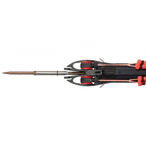 1. Ружье оснащено шестью тяжами S400, (Сами по себе тяжи S400 заслуживают отдельного разговора, так как на текущий момент являются одними из лучших в мире) Два тяжа располагаются в верхней части ружья, а четыре в нижней части. Верхние тяжи имеют диаметр 16 мм, а нижние 15 мм. Все эти тяжи в полностью заряженном состоянии дают общую нагрузку на гарпун в невероятные 156 кг. Именно поэтому снизу ружья две пары тяг – ведь далеко не каждый сможет зарядить ружье с нагрузкой в 156 кг. за один раз.